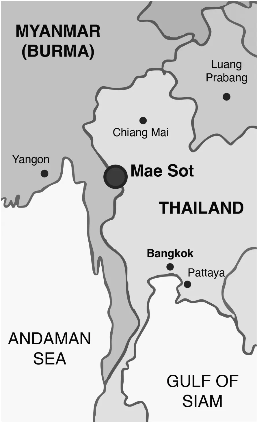 U izvesnom smislu, Mae Sot je produžetak tog malog peščanog spruda, u kome je koncept „državljanstva“ neuređen. Nalazi se na tajlandskoj strani granice, ali više deluje kao burmanski grad. Ljudi ovde govore burmanske jezike, a većina proizvodnje i potrošnje odvija se oko protoka ljudi koji dolaze iz Mjanmara. Malo njih poseduje zvanično državljanstvo. Neki su zaglavljeni u pravnom limbu, posedujući razne vrste privremene dokumentacije koju izdaju tajlandske vlasti. Drugi su tu bez ikakvog pravnog statusa, isključeni iz modernog poretka.