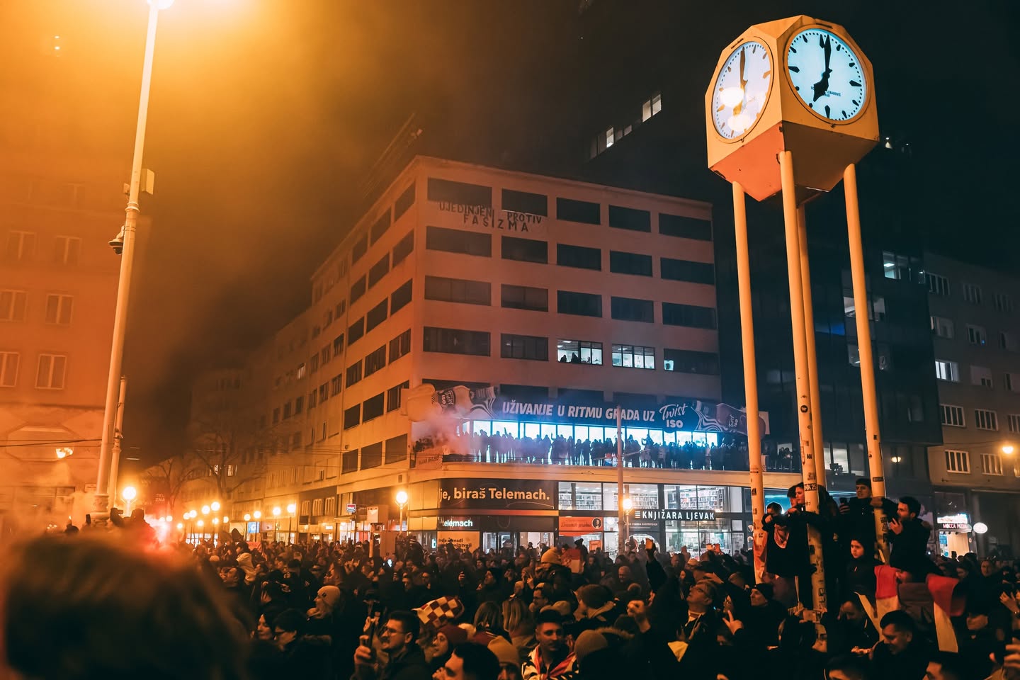 Prenosimo fotografiju i propratni tekst inicijative Ujedinjeni protiv fašizma, koja deluje na teritoriji Hrvatske. Transparent je okačen prilikom dočeka rukometaša Hrvatske u Zagrebu, povodom osvajanja bronzane medalje na Evropskom prvenstvu, što je, jelte odlična prilika da se urlaju nacionalističke infantilnosti u slavu države i gazda. Lepo je videti taj transparent. Istina, ne delimo entuzijam pratećeg teksta da su "demokracija" i "autokracija" suprotstavljeni pojmovi, deluje pre da su dve strane istog novčića, u zavisnosti od toga kako duvaju vetrovi kapitala i državnih interesa.